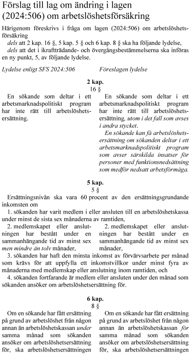 Riksdagen antar regeringens förslag till lag om ändring i lagen (2024:506) om arbetslöshetsförsäkring.