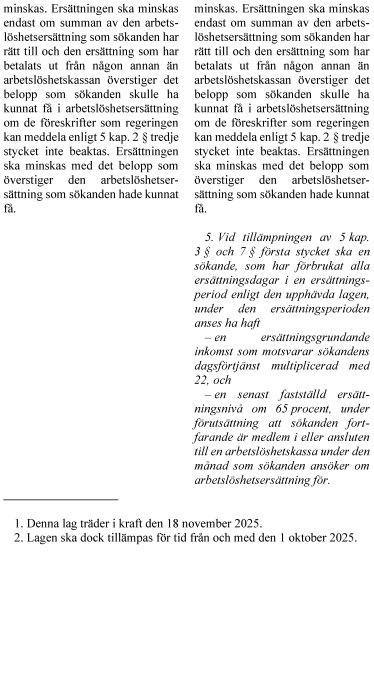 Regeringen föreslår att de aktuella lagändringarna ska träda i kraft den 18 november 2025. Bestämmelserna ska dock tillämpas för tid fr.o.m. den 1 oktober 2025, vilket är den dag som den nya lagen om arbetslöshetsförsäkring träder i kraft.