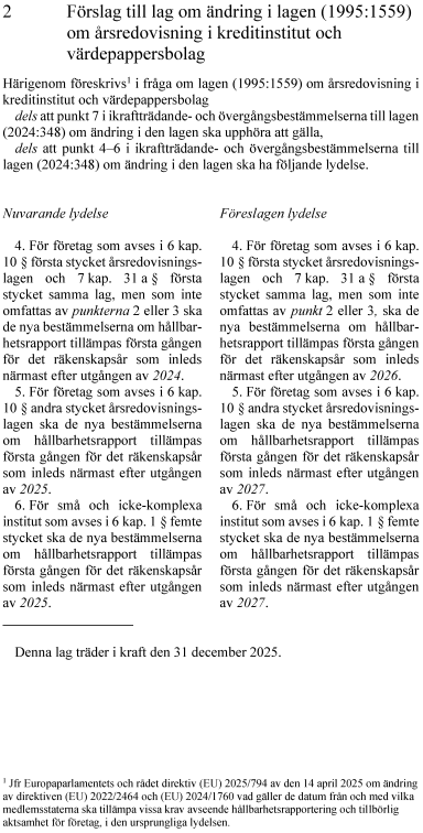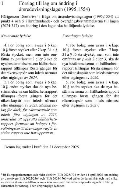 Regeringens förslag innebär att stora företag och moderföretag i stora koncerner som inte har fler än 500 anställda eller som har fler än 500 anställda men inte är börsnoterade ska tillämpa kravet på hållbarhetsrapportering första gången för det räkenskapsår som inleds närmast efter utgången av 2026. Små och medelstora börsnoterade företag ska enligt förslaget tillämpa kravet på hållbarhetsrapportering första gången för det räkenskapsår som inleds närmast efter utgången av 2027. Detsamma gäller för små och icke-komplexa institut samt captivebolag.