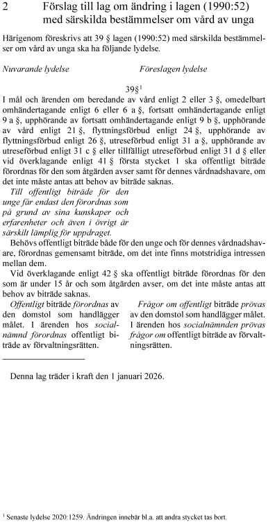 En följdändring av förslaget är att de särskilda lämplighetsreglerna för offentliga biträden för barn och unga tas bort i lagen (1990:52) med särskilda bestämmelser om vård av unga, förkortad LVU, lagen (2024:79) om placering av barn i skyddat boende och i 20 kap. 10 a § föräldrabalken. I de fall det finns särskild reglering som ställer upp strängare behörighetskrav på offentliga biträden än de som nu föreslås gäller de strängare kraven även fortsättningsvis.