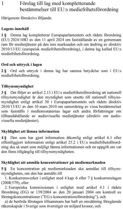 Förslaget innebär att de bestämmelser som krävs för att EU:s mediefrihetsförordning ska kunna tillämpas och få ett effektivt genomslag i Sverige samlas i en ny lag. Den nya lagen ska innehålla bestämmelser om bl.a. olika aktörers skyldigheter att lämna information till tillsynsmyndigheten (Mediemyndigheten), bedömningar av företagskoncentrationer på mediemarknaden och tillsyn. Vidare ska det finnas bestämmelser om tillsynsmyndighetens befogenheter och om överklagande av tillsynsmyndighetens beslut.