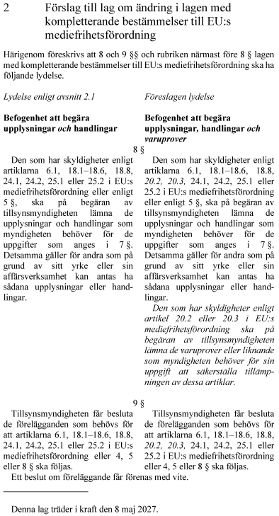 2. lag om ändring i lagen med kompletterande bestämmelser till EU:s mediefrihetsförordning.