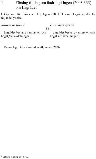 Regeringen föreslår att det högsta antalet avdelningar i Lagrådet ändras från fem till sex. Ändringen ska gälla under första halvåret 2026. Därefter ska Lagrådet på nytt högst bestå av fem avdelningar. Antalet justitieråd som samtidigt får tas i anspråk för tjänstgöring i Lagrådet ändras inte.