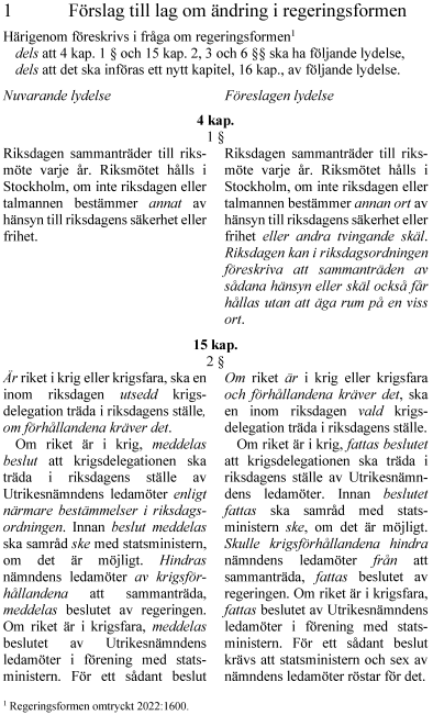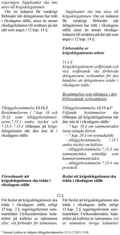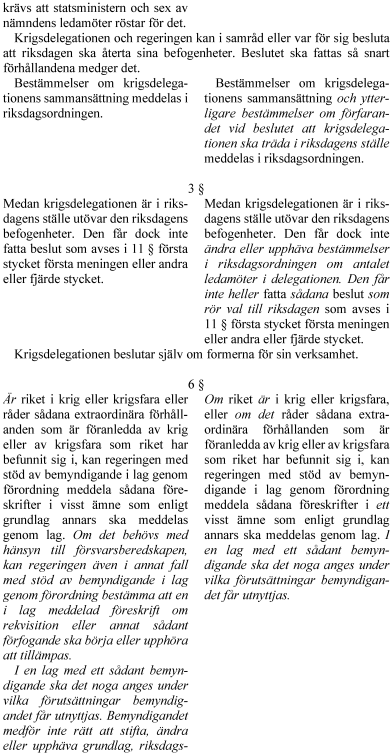 • Riksdagens krigsdelegation behålls för krig och krigsfara, och reglerna om delegationen justeras. Bland annat får talmannen en roll som motsvarar den i riksdagen. Vidare ska en ledamot som blir statsråd inte längre kunna ingå i delegationen.