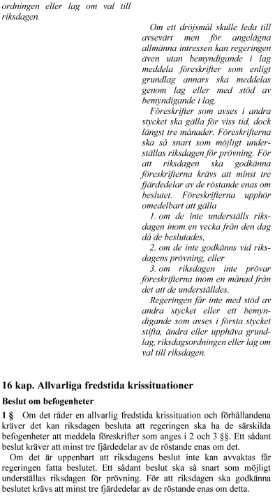 • Det införs nya bestämmelser om normgivning i allvarliga fredstida krissituationer. Regleringen innebär att riksdagen med kvalificerad majoritet ska kunna ge regeringen särskilda befogenheter att meddela föreskrifter om det behövs för att hantera krissituationen. Befogenheterna ska när som helst kunna återkallas av riksdagen.