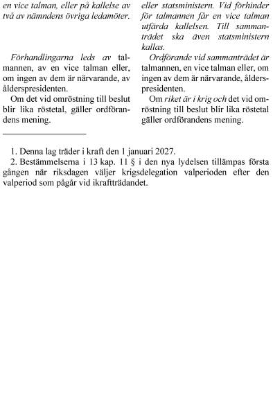 Riksdagen antar som vilande regeringens förslag till lag om ändring i regeringsformen och lag om ändring i riksdagsordningen i de delar det avser huvudbestämmelserna. Riksdagen beslutar att behandlingen av regeringens förslag till lag om ändring i riksdagsordningen i de delar det avser tilläggsbestämmelserna får skjutas upp till 2026/27 års riksmöte.