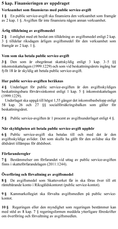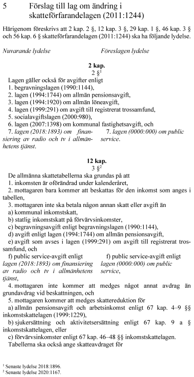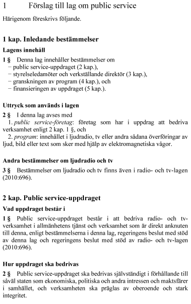 1. Riksdagen antar regeringens förslag till lag om public service.
