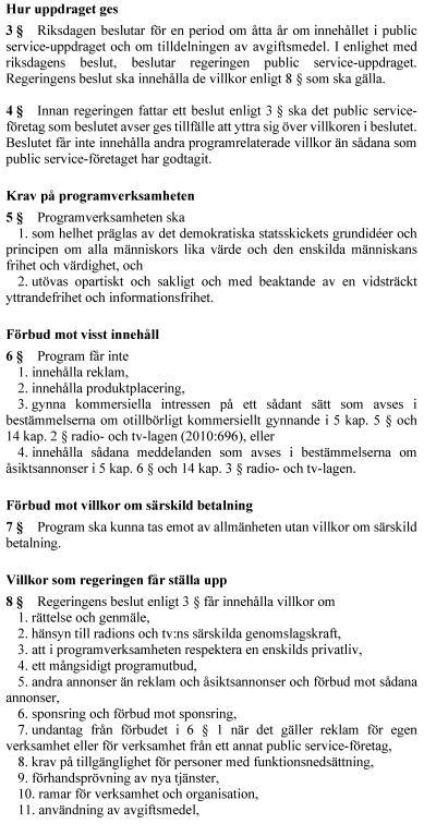13. Riksdagen godkänner vad regeringen föreslår om hur innehållsuppdraget ska utformas (avsnitt 9).