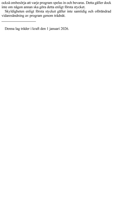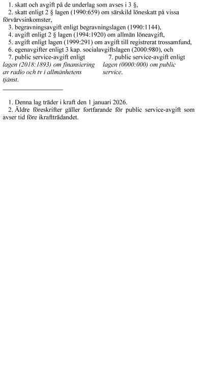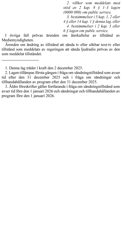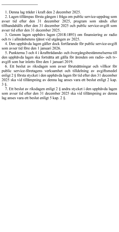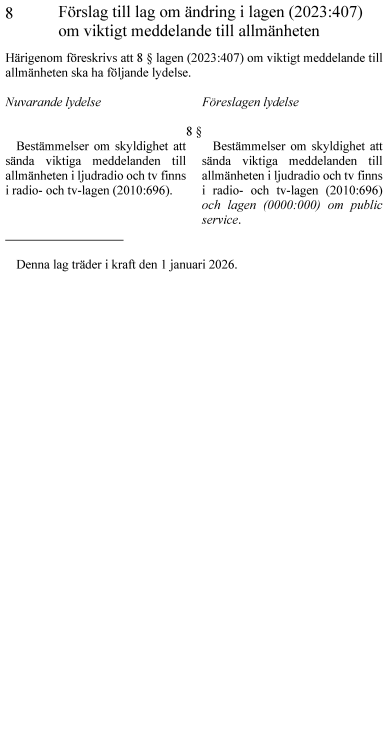 Lagen om public service och ändringarna i radio- och tv-lagen föreslås träda i kraft den 2 december 2025 och övriga lagändringar den 1 januari 2026.