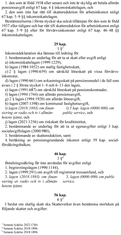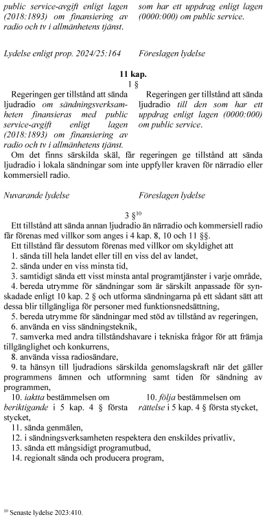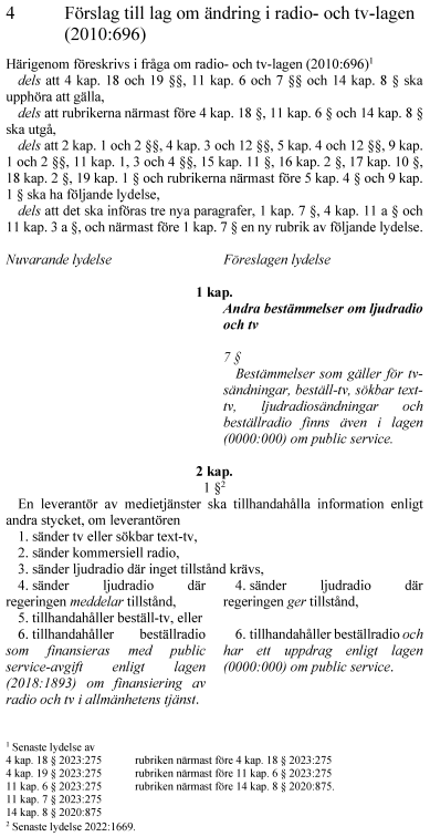 Lagändringarna innebär att bl.a. bestämmelser om public service-uppdraget och finansieringen av uppdraget samlas i en ny lag om public service. Lagen om finansiering av radio och tv i allmänhetens tjänst upphävs.