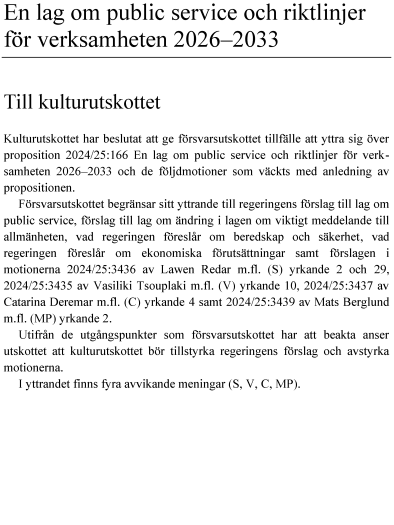 Utskottet föreslår att riksdagen även godkänner regeringens övriga förslag om bl.a. utformningen av public service-uppdraget och de ekonomiska förutsättningarna för public service-företagen under uppdragsperioden 2026–2033.