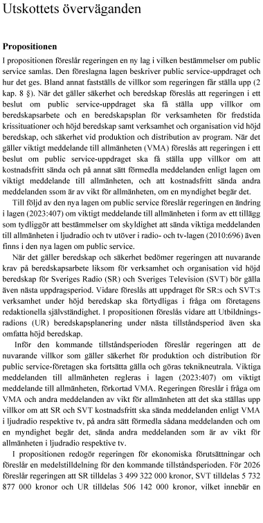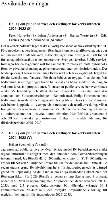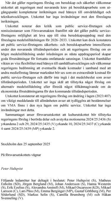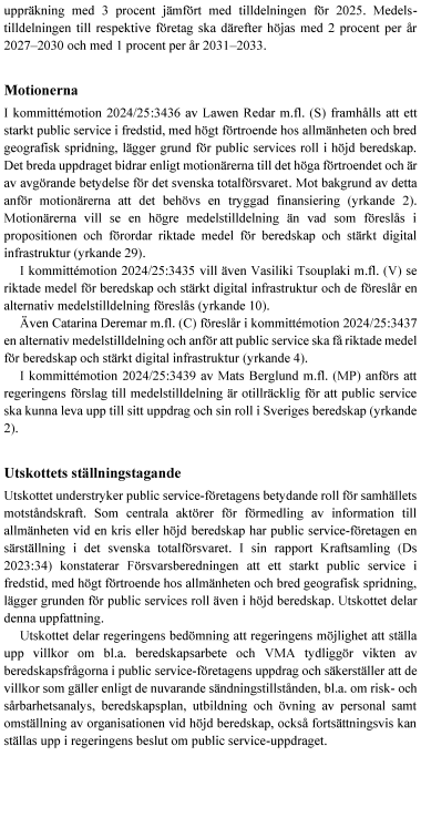 Min bedömning är att det budgetförslag som nu läggs fram är långt ifrån tillräckligt för att hela det uppdrag som propositionen föreslår ska kunna genomföras på ett tillfredsställande sätt. Jag delar inte regeringens bild av att det finns stora möjligheter till effektivisering och samverkan som kan spara pengar samtidigt som kraven kvarstår på att ha ett brett nyskapande utbud med hög kvalitet, folkbildande ambitioner och lokal närvaro. Jag anser att public service behöver riktade medel för beredskap och stärkt digital infrastruktur i enlighet med den anmodan som Försvarsberedningen kommit in med. Jag föreslår därför 200 miljoner kronor till SVT, 100 miljoner kronor till SR och 50 miljoner kronor till UR för det ändamålet. Detta skulle sedan utgöra en grund för en nivåhöjning under hela tillståndsperioden och en grund för uppräkning eftersom det handlar om årliga kostnader, i likhet med det företagen äskar. För 2026 föreslår vi sedan en uppräkning på 3 procent, under 2027–2030 en uppräkning på 2,6 procent och de tre sista åren, 2031–2033, på 2,3 procent. Vad som anförs ovan om riktade satsningar på beredskap och stärkt digital infrastruktur och de procentsatser för åren 2026–2033 som framgår av vår motion bör riksdagen ställa sig bakom och ge regeringen till känna.
