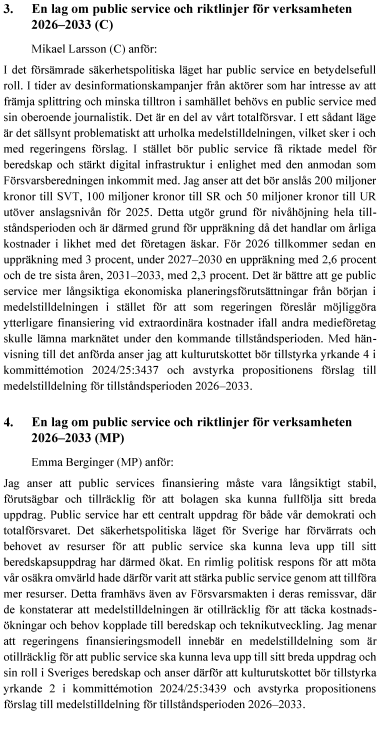 Miljöpartiet anser att public services finansiering måste vara långsiktigt stabil, förutsägbar och tillräcklig för att public service-företagen ska kunna fullfölja sitt breda uppdrag. Regeringens finansieringsmodell, baserad på kommitténs förslag, innebär en uppräkning av medelstilldelningen med 3 procent för 2026, därefter 2 procent per år 2027–2030 och 1 procent per år 2031–2033. Jag menar att denna nivå på medelstilldelningen är otillräcklig för att public service ska kunna leva upp till sitt breda uppdrag och sin roll i Sveriges beredskap. I ett läge med hög inflation och ökade kostnader kommer en alltför låg uppräkning att urholka public service-företagens ekonomi.