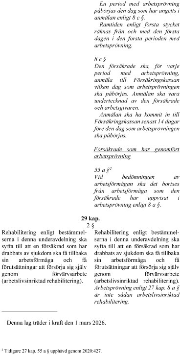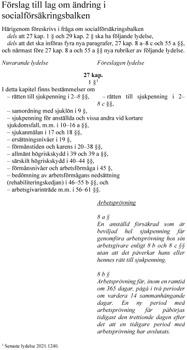 Riksdagen antar regeringens förslag till ändringar i socialförsäkringsbalken. Förslagen innebär att en försäkrad som har rätt till hel sjukpenning i överenskommelse med sin arbetsgivare får möjlighet att arbetspröva hos arbetsgivaren med bibehållen sjukpenning under en begränsad tid.