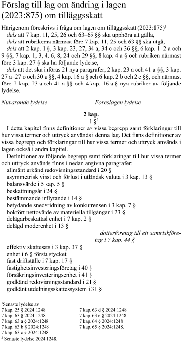 I propositionen föreslår regeringen ytterligare kompletteringar till bestämmelserna om tilläggsskatt för företag i stora koncerner. Den 24 maj 2024 antog IF ytterligare administrativa riktlinjer. I den utsträckning det är fråga om förtydliganden och exempel omfattas riktlinjerna redan av de bestämmelser som finns i lagen om tilläggsskatt. Lagen behöver dock kompletteras med ytterligare eller ändrade bestämmelser.