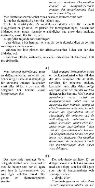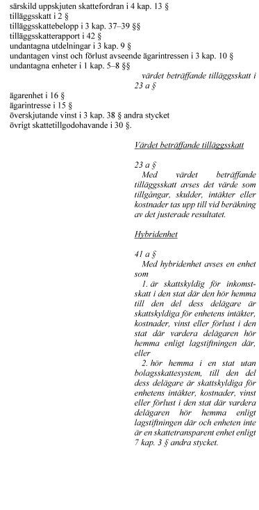 Definitionen av hybridenhet kompletteras så att även en enhet som hör hemma i en stat utan bolagsskattesystem omfattas, om enheten beskattas hos delägarna i den stat där dessa hör hemma och enheten inte är en skattetransparent enhet enligt lagen om tilläggsskatt.