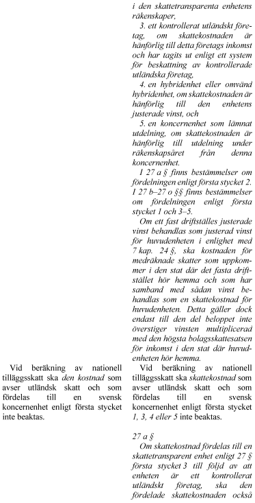 Modellreglerna är ett koordinerat system för beskattning av lågbeskattade vinster genom att tilläggsskatt tas ut på sådana vinster av koncernenheter som hör hemma i en annan stat. Reglerna ska genomföras i form av ett gemensamt tillvägagångssätt (”common approach”). Det innebär att de stater som enats om reglerna inte är förbundna att införa dem i nationell rätt, men om de gör det ska reglerna införas och administreras i enlighet med modellreglerna och tillhörande kommentar. Regeringen föreslog i propositionen Tilläggsskatt för företag i stora koncerner bl.a. att det skulle införas bestämmelser i svensk rätt som motsvarar de materiella bestämmelserna i minimibeskattningsdirektivet samt att bestämmelserna skulle tas in i en särskild lag om tilläggsskatt (prop. 2023/24:32 s. 121 och 122). Riksdagen beslutade i allt väsentligt i enlighet med regeringens förslag. Lagen (2023:875) om tilläggsskatt trädde i kraft den 1 januari 2024.