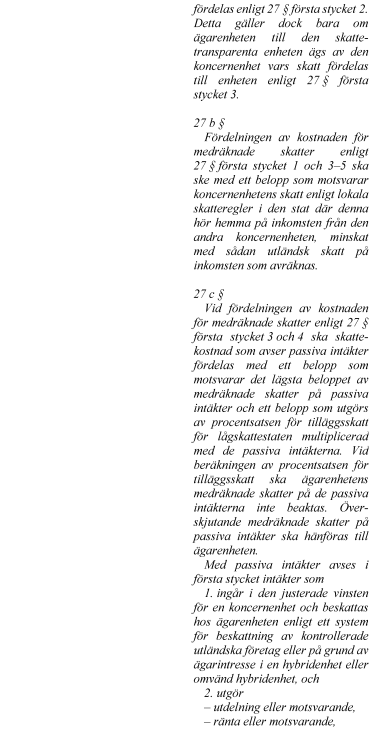 Regeringen föreslår att när en skattekostnad fördelas från en skattetransparent enhet till dess ägarenhet ska även en skattekostnad som fördelats till den skattetransparenta enheten till följd av att enheten är ett kontrollerat utländskt företag fördelas till ägarenheten om den ägs av den koncernenhet vars skatt fördelats till den skattetransparenta enheten.