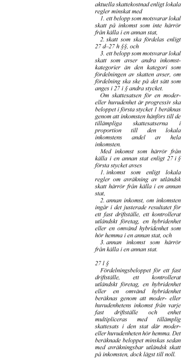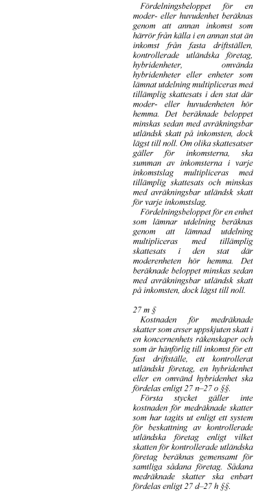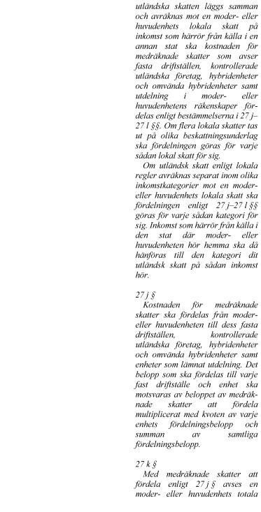 Det ska också enligt förslaget införas bestämmelser om hur medräknade skatter som avser aktuell skatt ska fördelas till ett fast driftställe, ett kontrollerat utländskt företag, en hybridenhet, en omvänd hybridenhet och en utdelande enhet när avräkning av utländsk skatt sker genom s.k. overallavräkning eller avräkning inom olika inkomstkategorier.