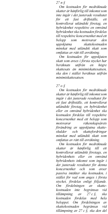Regeringen föreslår att kostnaden för medräknade skatter i en koncernenhets räkenskaper ska fördelas till en omvänd hybridenhet om den är hänförlig till den omvända hybridenhetens justerade vinst. Vid beräkning av nationell tilläggsskatt ska skattekostnad som fördelas till en omvänd hybridenhet som är en svensk koncernenhet inte beaktas. I fråga om skattekostnad som avser passiva intäkter ska fördelningen motsvara det lägsta beloppet av medräknade skatter på passiva intäkter och ett belopp som utgörs av procentsatsen för tilläggsskatt för lågskattestaten multiplicerad med de passiva intäkterna. Vid beräkningen av procentsatsen för tilläggsskatt ska ägarenhetens medräknade skatter på de passiva intäkterna inte beaktas. Överskjutande medräknade skatter på passiva intäkter ska hänföras till ägarenheten.