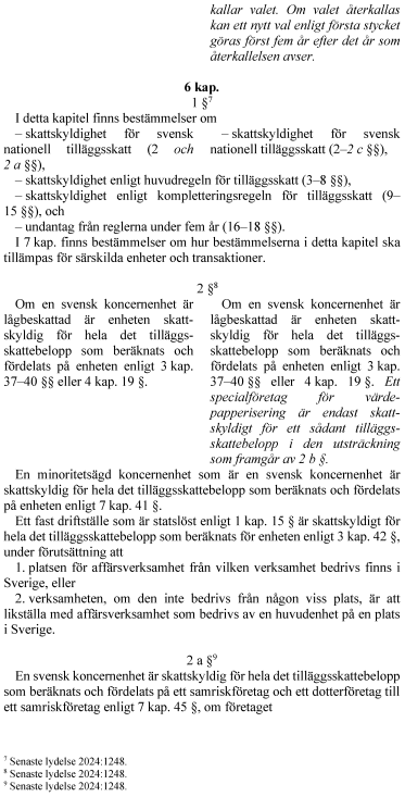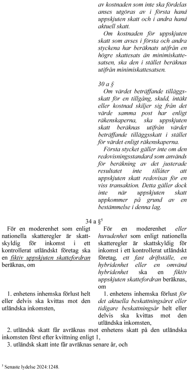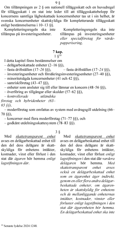 Med anledning av att OECD och G20:s inkluderande ramverk för att motverka skattebaserodering och vinstförflyttningar antog administrativa riktlinjer i maj 2024 har regeringen föreslagit en rad kompletteringar av bestämmelserna om tilläggsskatt. Kompletteringarna ska säkerställa att lagen kan tillämpas på avsett sätt och att de administrativa riktlinjerna följs. Kompletteringarna innebär att det bl.a. införs bestämmelser om hur återföringsregeln för uppskjutna skatteskulder ska tillämpas, om hur uppskjutna skattefordringar och skatteskulder under vissa förutsättningar ska fastställas för tilläggsskatteändamål, allokering av vinster och skatter i vissa strukturer som involverar skattetransparenta enheter samt behandlingen av specialföretag för värdepapperisering.