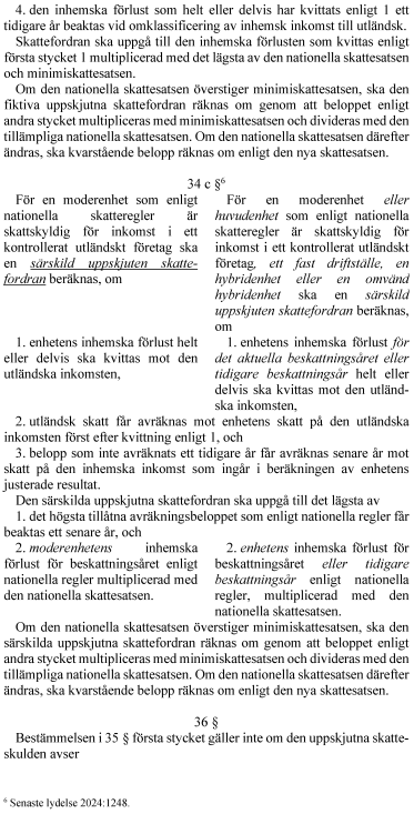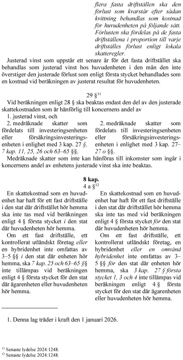 Regeringen föreslår att lagändringarna ska träda i kraft den 1 januari 2026. Bestämmelserna ska tillämpas första gången för beskattningsår som börjar närmast efter den 31 december 2025, eller i fråga om svenska handelsbolag, räkenskapsår som börjar närmast efter den 31 december 2025.