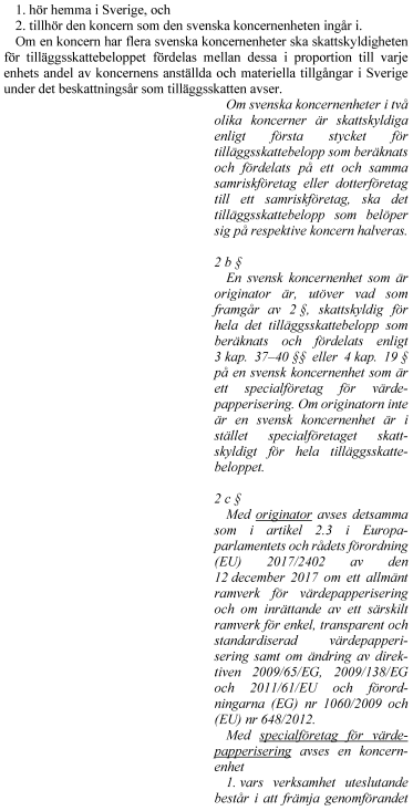 Regeringen föreslår att det är originatorn som är skattskyldig för det nationella tilläggsskattebelopp som beräknats och fördelats på en svensk koncernenhet som är ett specialföretag för värdepapperisering om originatorn är en koncernenhet som hör hemma i Sverige. Om originatorn inte hör hemma i Sverige är den koncernenhet som är ett specialföretag för värdepapperisering skattskyldig för sin nationella tilläggsskatt. En koncernenhet som är ett specialföretag för värdepapperisering är inte skattskyldig för en annan koncernenhets nationella tilläggsskatt eller för kompletterande tilläggsskatt.
