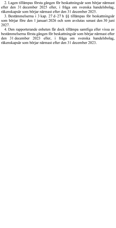 Lagändringarna föreslås träda i kraft den 1 januari 2026. Det införs dock en möjlighet för den rapporterande enheten att begära att samtliga eller vissa av bestämmelserna ska tillämpas första gången för beskattningsår som börjar närmast efter den 31 december 2023 eller, i fråga om svenska handelsbolag, räkenskapsår som börjar närmast efter den 31 december 2023.