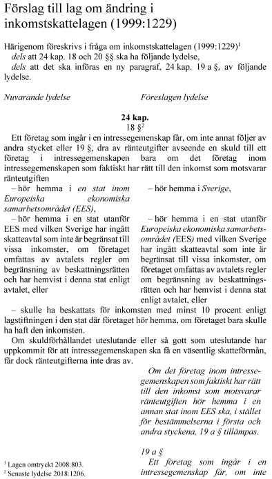 Regeringen föreslår ändringar i inkomstskattelagen för att anpassa de riktade ränteavdragsbegränsningsreglerna till EU-rätten. Enligt förslaget ska ett företag som ingår i en intressegemenskap inte få dra av ränteutgifter, helt eller delvis, till ett företag i intressegemenskapen, om det företag inom intressegemenskapen som faktiskt har rätt till den inkomst som motsvarar ränteutgiften hör hemma i en annan stat inom EES och skuldförhållandet ingår i ett konstlat upplägg vars syfte är att intressegemenskapen ska få en väsentlig skatteförmån.