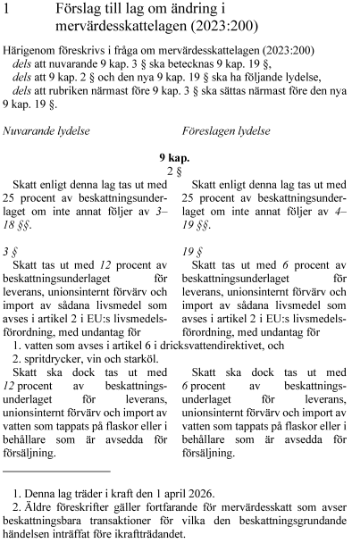 I budgetpropositionen för 2026 gjorde regeringen bedömningen att mervärdesskattesatsen på livsmedel tillfälligt bör sänkas från 12 procent till 6 procent under perioden fr.o.m. den 1 april 2026 t.o.m. den 31 december 2027 (prop. 2025/26:1).
