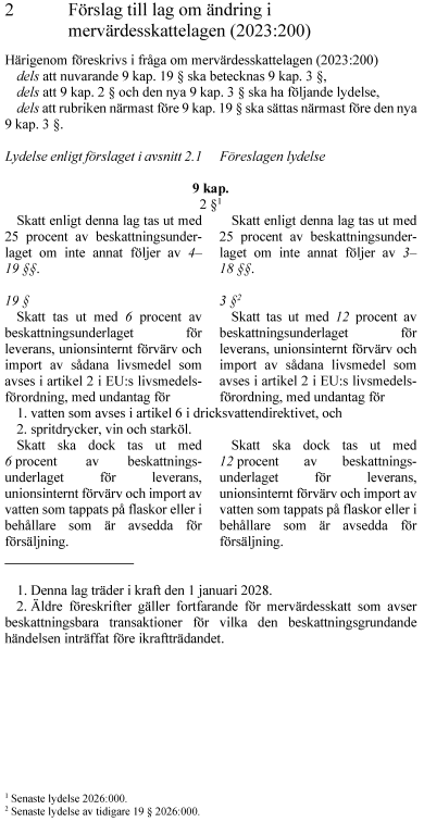 I propositionen föreslår regeringen att mervärdesskattesatsen på livsmedel ska sänkas från 12 procent till 6 procent under perioden fr.o.m. den 1 april 2026 t.o.m. den 31 december 2027.