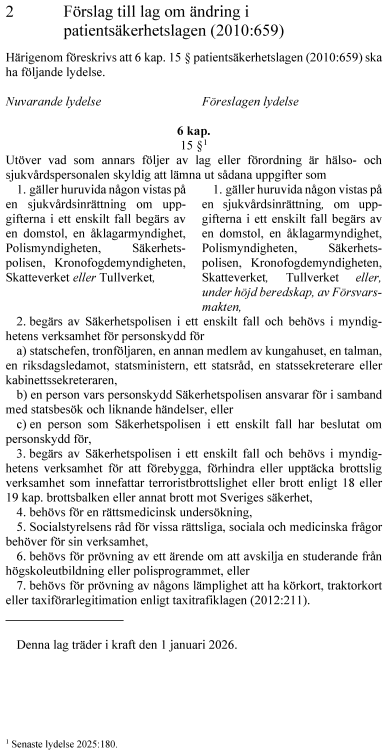 Regeringen föreslår även en ändring i patientsäkerhetslagen (2010:659) som innebär en utvidgning av hälso- och sjukvårdspersonalens skyldighet att under höjd beredskap på begäran lämna uppgifter till Försvarsmakten om huruvida någon vistas på en sjukvårdsinrättning. Vidare föreslår regeringen en ändring i lagen (2006:546) om utrymning och inkvartering m.m. under höjd beredskap. Ändringen innebär att den lagens bestämmelser om att i skälig omfattning lämna hjälp till de kommuner och regioner som i större omfattning får ta emot befolkningen på grund av en utrymning inte ska gälla om annat följer av de bestämmelser om hjälp vid katastroftillstånd som föreslås i hälso- och sjukvårdslagen.