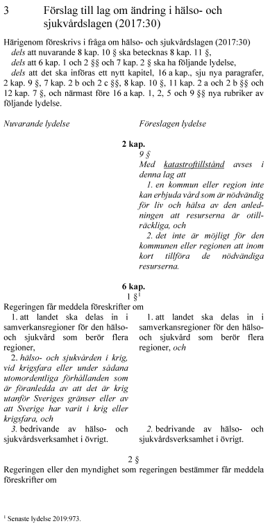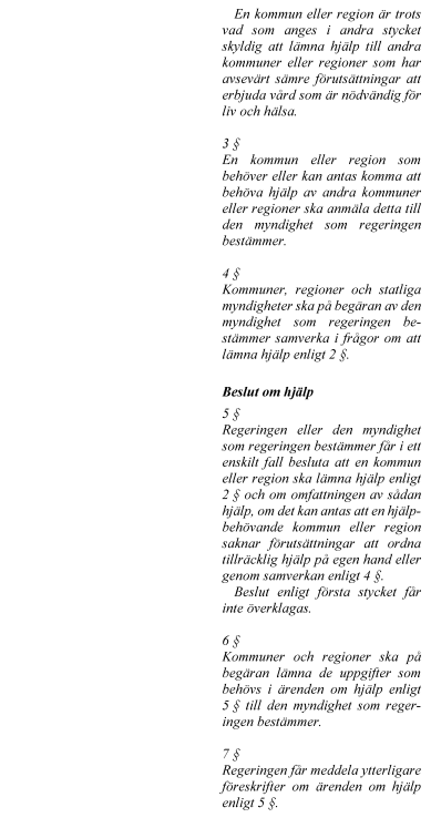 Regeringen föreslår också att kommuner och regioner ska vara skyldiga att skyndsamt lämna hjälp till andra kommuner och regioner där det råder katastroftillstånd i hälso- och sjukvården. Med katastroftillstånd avses enligt förslaget att en kommun eller region inte kan erbjuda vård som är nödvändig för liv och hälsa av den anledningen att resurserna är otillräckliga och det inte är möjligt för kommunen eller regionen att inom kort tillföra de nödvändiga resurserna.