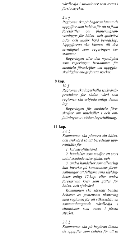 Regeringen föreslår vidare bestämmelser som tydliggör kommuners och regioners skyldigheter att planera sin hälso- och sjukvård för att upprätthålla beredskap för katastroftillstånd, händelser som medför ett stort antal skadade och sjuka samt andra händelser som allvarligt kan inverka på deras förutsättningar att fullgöra skyldigheterna att erbjuda vård enligt hälso- och sjukvårdslagen eller andra föreskrivna krav som gäller för hälso- och sjukvård.