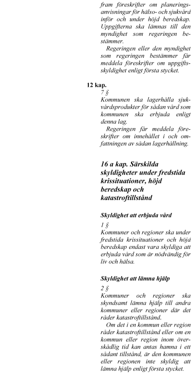 Förslagen innebär att det förtydligas vilka skyldigheter kommuner och regioner har att erbjuda vård och hjälpa varandra under fredstida krissituationer, höjd beredskap och katastroftillstånd. Det förtydligas även vilka skyldigheter kommuner, regioner och vårdgivare har i situationer då ett katastroftillstånd inte upphör trots hjälp. Vidare tydliggörs skyldigheterna för kommuner och regioner att planera för vissa svåra förhållanden, bl.a. händelser som medför ett stort antal skadade och sjuka. Det införs också en skyldighet för kommuner och regioner att hålla sjukvårdsprodukter i lager.