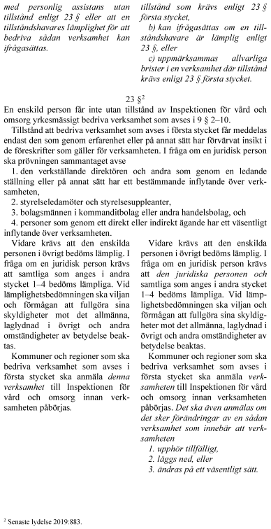 Vidare framgår av propositionen att det ska tydliggöras i SoL och LSS att den juridiska person som ansöker om tillstånd eller innehar ett tillstånd att bedriva tillståndspliktig verksamhet ska vara lämplig, vilket också gäller dennes företrädare.