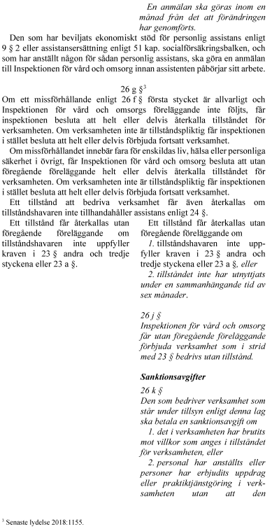 Inspektionen för vård och omsorg ska ges utökade möjligheter att ingripa mot verksamheter som inte uppfyller lagstiftningens krav, bl.a. genom att sanktionsavgift införs i vissa fall och att olovliga verksamheter omedelbart ska kunna förbjudas. Tillstånd för verksamheter som varit vilande under en längre period ska kunna återkallas. Det införs ett straffansvar för den som fortsätter att bedriva en verksamhet i strid mot ett förbud enligt lagen om stöd och service till vissa funktionshindrade. Dessutom förtydligas det att den lämplighetsprövning som ska göras vid en tillståndsprövning även ska omfatta den juridiska personen. För att stärka Inspektionen för vård och omsorgs möjlighet till en effektiv tillsyn ska kommunerna få en utökad anmälningsskyldighet till myndigheten. Den särskilda avgiften för gynnande beslut om insatser som inte verkställs inom skälig tid och rapporteringsintervallet för sådana beslut bör vara kvar och den särskilda avgiften ska höjas. Lagändringarna föreslås träda i kraft den 1 januari 2026.