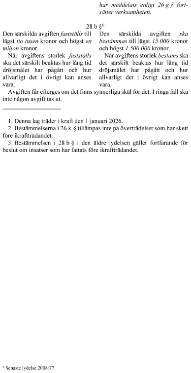Lagändringarna ska träda i kraft den 1 januari 2026. Bestämmelserna om sanktionsavgifter tillämpas första gången vid ingripande mot överträdelser som sker efter ikraftträdandet. Bestämmelserna om särskild avgift tillämpas på beslut om insatser enligt SoL respektive LSS som fattas efter ikraftträdandet.