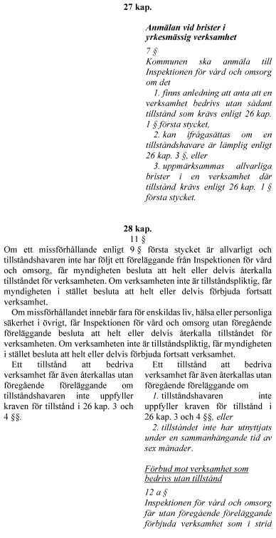 I dag har en kommun skyldighet att anmäla till Ivo när det finns anledning att anta att personlig assistans bedrivs utan tillstånd eller att tillståndshavares lämplighet att bedriva verksamheten kan ifrågasättas. Av propositionen framgår att den skyldigheten utökas till att omfatta all verksamhet som kräver tillstånd enligt LSS. Motsvarande anmälningsskyldighet ska också gälla för verksamhet som kräver tillstånd enligt SoL. Därutöver ska en kommun anmäla till Ivo om kommunen uppmärksammar allvarliga brister i sådan verksamhet där det krävs tillstånd enligt SoL eller LSS.