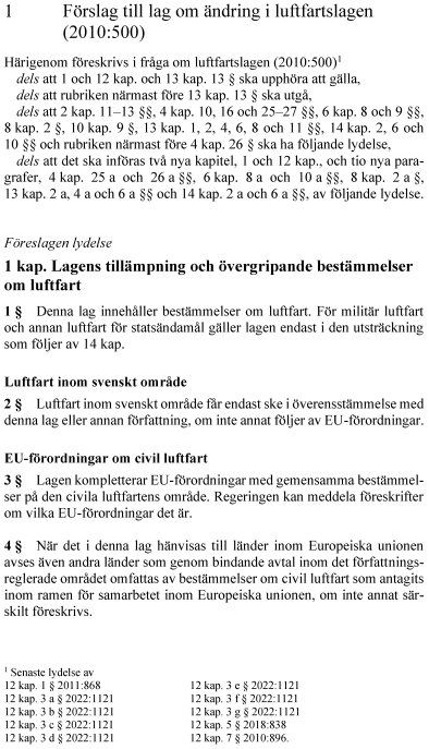 1. Riksdagen antar regeringens förslag till lag om ändring i luftfartslagen (2010:500).