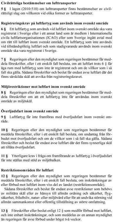 Regeringen pekar på att den i dag har en möjlighet att meddela föreskrifter eller i ett enskilt fall besluta om inskränkningar av eller förbud mot luftfart inom viss del av landet, ett s.k. restriktionsområde. Det krävs då att det finns militära skäl eller att det behövs av hänsyn till allmän ordning och säkerhet, friluftsliv, natur- eller miljövård eller för att undvika störning vid en allmän sammankomst eller offentlig tillställning av större omfattning. I enlighet med luftfartsförordningen är det Transportstyrelsen som har mandat att besluta om restriktionsområden i enskilda fall. Utöver denna möjlighet att inskränka eller förbjuda luftfart inom en viss del av landet har regeringen en möjlighet att meddela föreskrifter om tillfälliga inskränkningar av eller förbud mot luftfart inom hela landet under utomordentliga förhållanden eller när det i övrigt krävs av hänsyn till allmän säkerhet. Detta mandat kan inte delegeras vidare till någon myndighet.