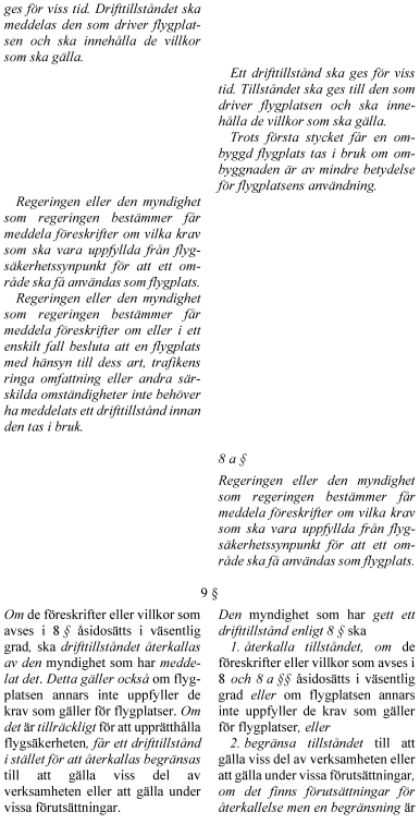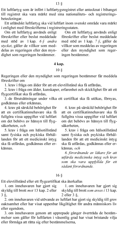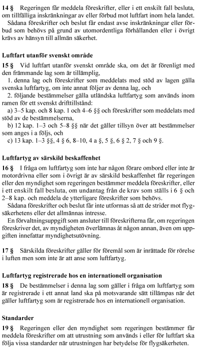 Det nationella regelverket i Sverige består i huvudsak av luftfartslagen (2010:500), luftfartsförordningen (2010:770) och Transportstyrelsens föreskrifter. I luftfartslagen och luftfartsförordningen finns det bestämmelser som rör tillämpningsområdet, vissa detaljbestämmelser för luftfarten samt straffbestämmelser. I lagen och förordningen finns det bestämmelser både för den civila luftfarten och för statsluftfarten. I enlighet med luftfarts-förordningen har Transportstyrelsen mandat att besluta och föreskriva på flertalet områden för den civila luftfarten och för statsluftfarten, och detta sker genom myndighetens föreskrifter (TSFS).
