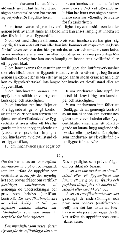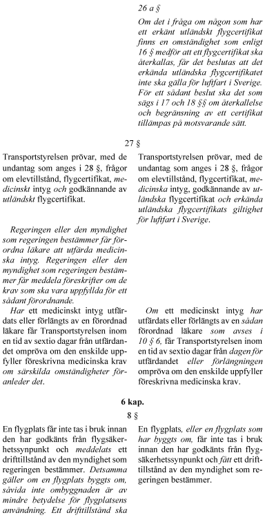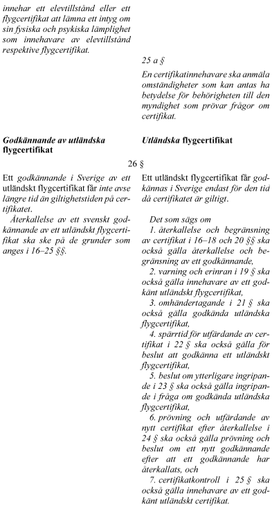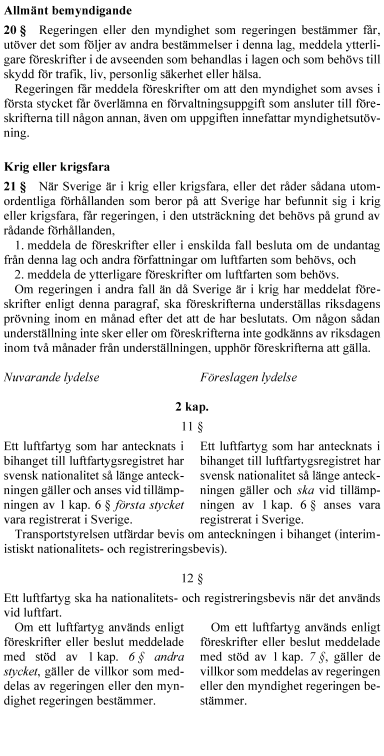 Regeringen föreslår också att det ska vara möjligt för Transportstyrelsen att besluta att erkända utländska flygcertifikat inte ska gälla för luftfart i Sverige.