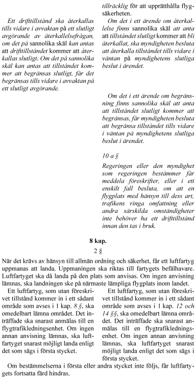 Utskottet ställer sig bakom regeringens förslag till ändringar i luftfartslagen och miljöbalken och avstyrker ett yrkande i en följdmotion. Lagändringarna innebär bl.a. att det införs effektivare sanktioner inom luftfartsområdet och att luftfartslagens straffbestämmelser även kommer att omfatta överträdelser av bestämmelser i EU-förordningar. Regeringen kommer även i fortsättningen att få meddela föreskrifter om tillfälliga inskränkningar av eller förbud mot luftfart inom hela landet under utomordentliga förhållanden eller när det i övrigt krävs av hänsyn till allmän säkerhet. Regeringen får därutöver genom lagändringarna besluta om tillfälliga inskränkningar av eller förbud mot luftfart inom hela landet i ett enskilt fall under de angivna förutsättningarna.