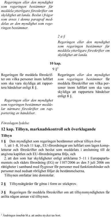 Regeringen ska enligt förslaget få meddela föreskrifter om att den som bryter mot en bestämmelse i en EU-förordning med gemensamma bestämmelser på det civila luftfartsområdet ska dömas till böter. Vidare ska regeringen kunna delegera möjligheten att meddela föreskrifter om vem som ska ha en skyldighet att lämna händelserapporter.