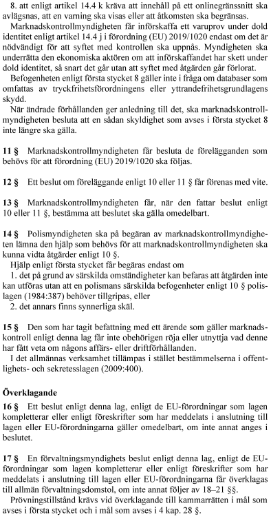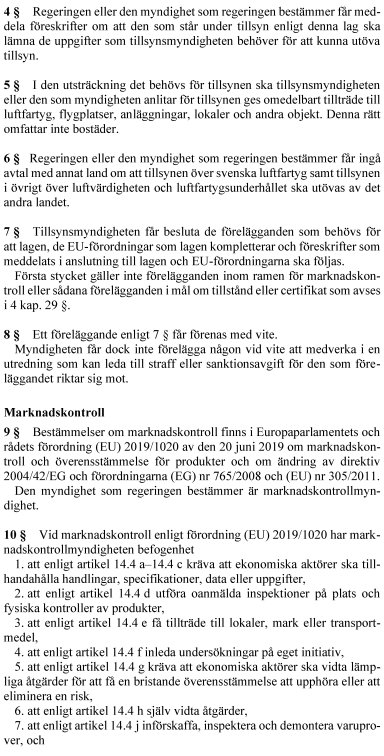 Regeringen föreslår vidare att tillsynsmyndigheten ska kunna fatta beslut om de förelägganden som behövs för att luftfartslagen, de EU-förordningar som lagen kompletterar och de föreskrifter som har meddelats i anslutning till lagen och EU-förordningarna ska följas. Förelägganden som meddelas av myndigheten ska enligt förslaget kunna förenas med vite. Vidare ska det inte vara möjligt att förelägga någon att vid vite medverka i en utredning av en gärning som kan leda till straff eller sanktionsavgift för den personen.