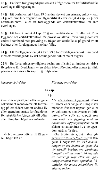 Enligt regeringens förslag ska vårdslöshet i lufttrafik som inte är grov kunna ligga till grund för ansvar, och det förtydligas när ett brott ska bedömas som grovt.
