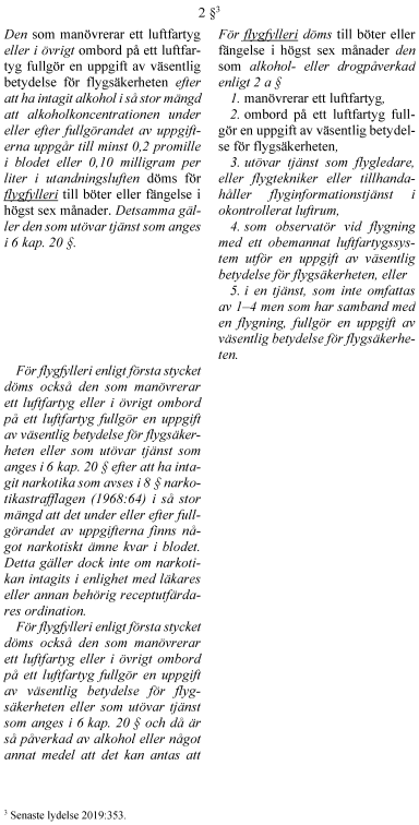 Regeringen föreslår att en person som utanför ett flygplan i en tjänst som har samband med en flygning fullgör en uppgift som har väsentlig betydelse för flygsäkerheten ska dömas för flygfylleri om han eller hon är påverkad av alkoholhaltiga drycker eller något annat medel.