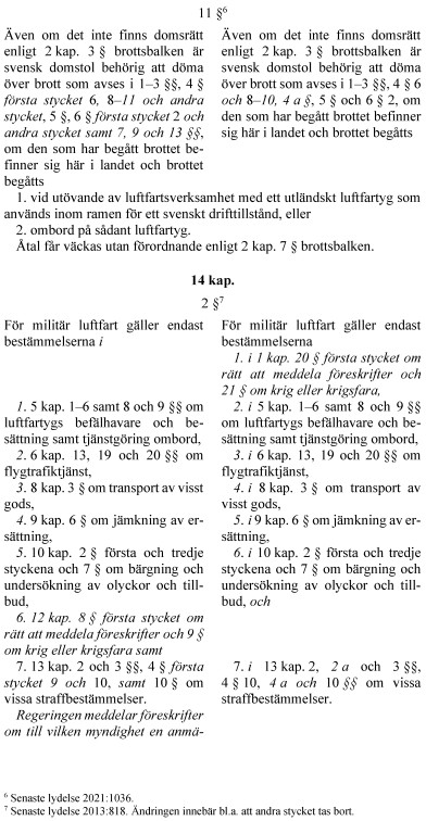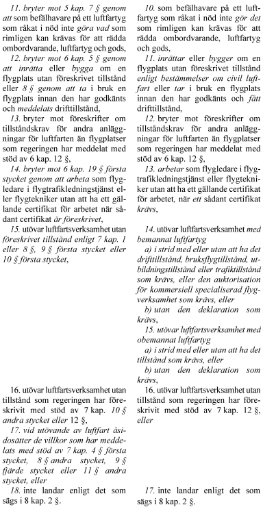 I förarbetena till luftfartslagen saknas en närmare motivering till valet av olika straffbestämmelser. En trolig orsak till de olika varianterna är att det är svårt att tillräckligt detaljerat och uttömmande ange den brottsliga gärningen genom en fullständig brottsbeskrivning. Den civila luftfarten består av en stor mängd detaljerade bestämmelser som i många fall berör samma område, trots att de finns på olika ställen i regelverken. Det kan därför finnas tillfällen där det inte är möjligt att ange det straffbara området närmare än genom att hänvisa till föreskrifter inom ett visst område. I många fall är det dock både möjligt och bättre att tydligt ange den straffbara gärningen.