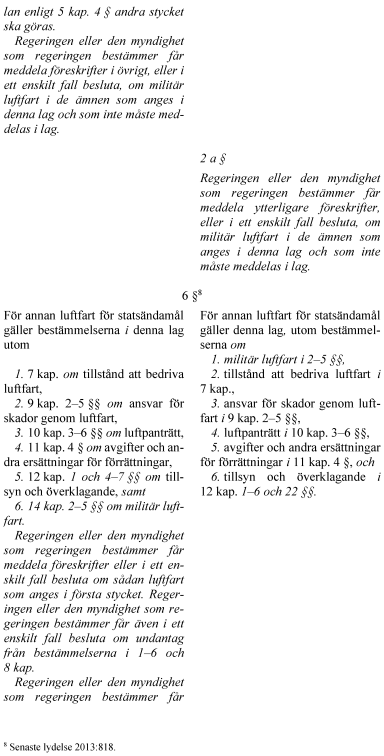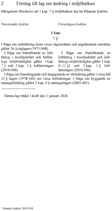 I propositionen föreslås ändringar i luftfartslagen (2010:500) och miljöbalken.